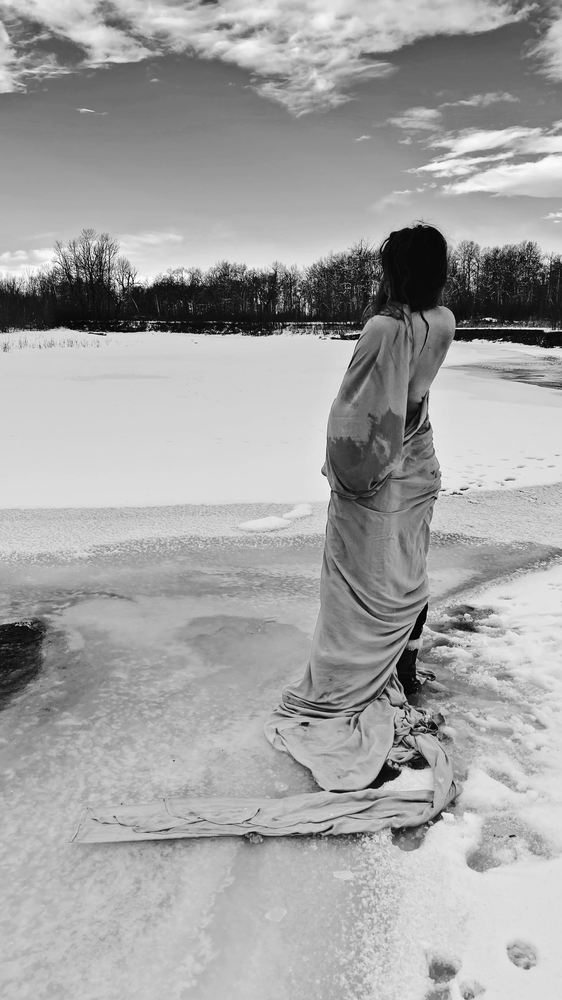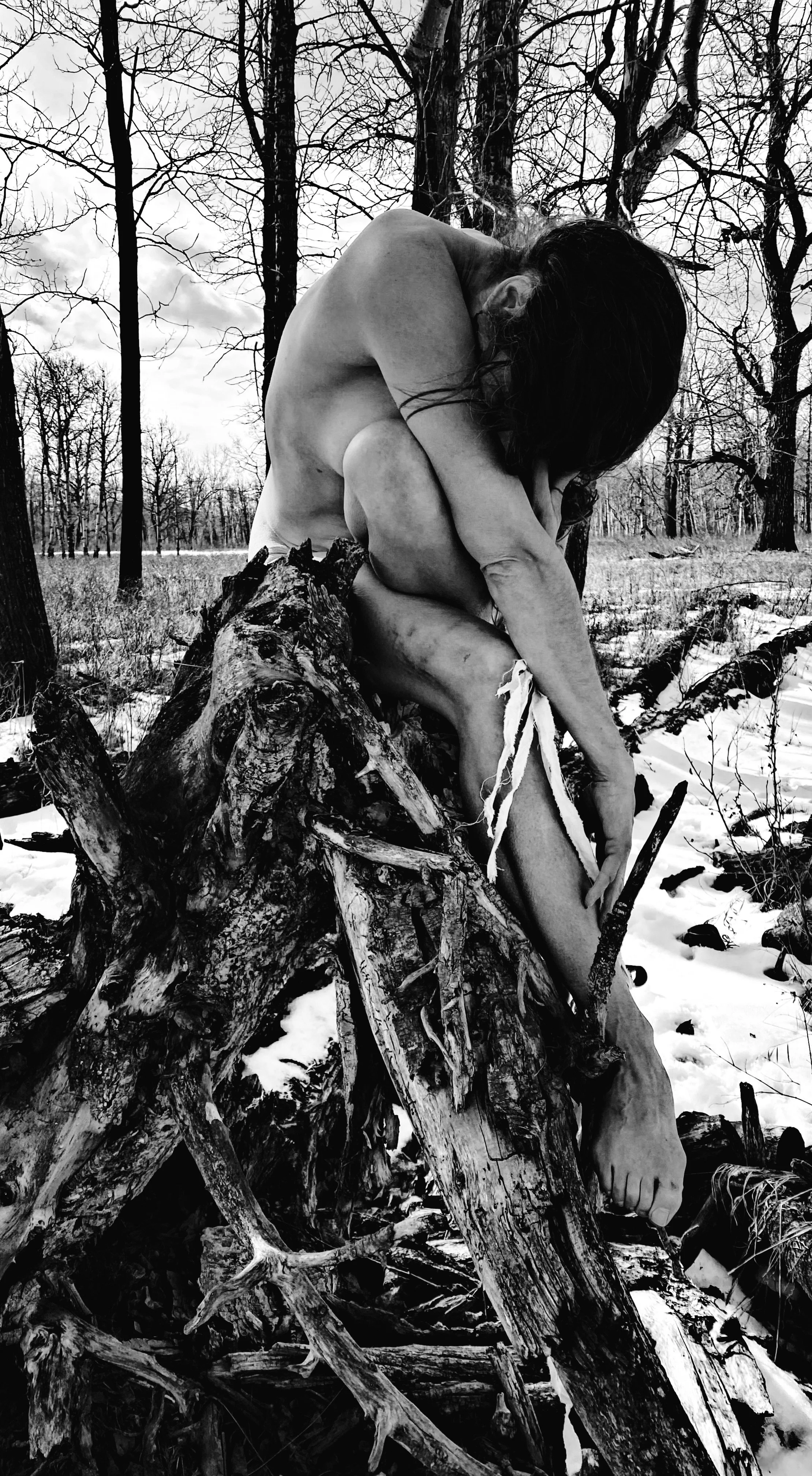 The unforgiving, raw quality of the Alberta landscape appeals to my senses and has truly become the canvas upon which I write. I choose to wield my own body not for display, but rather necessity, as I cannot ask any model to take on the inherent risk or toll on the body that I am willing to go through for a given shot. I have fallen out of a tree when a massive limb cracked, experienced hypothermia, minor shock, abrasions, bruising and my most recent finished work “Shaimaylia,’ featured below involved the use of toxic paint surrounding both my eyes and a found snare around my neck. These choices are intentional. The intent is not to injure or harm, but rather to tell an authentic story by any means necessary.