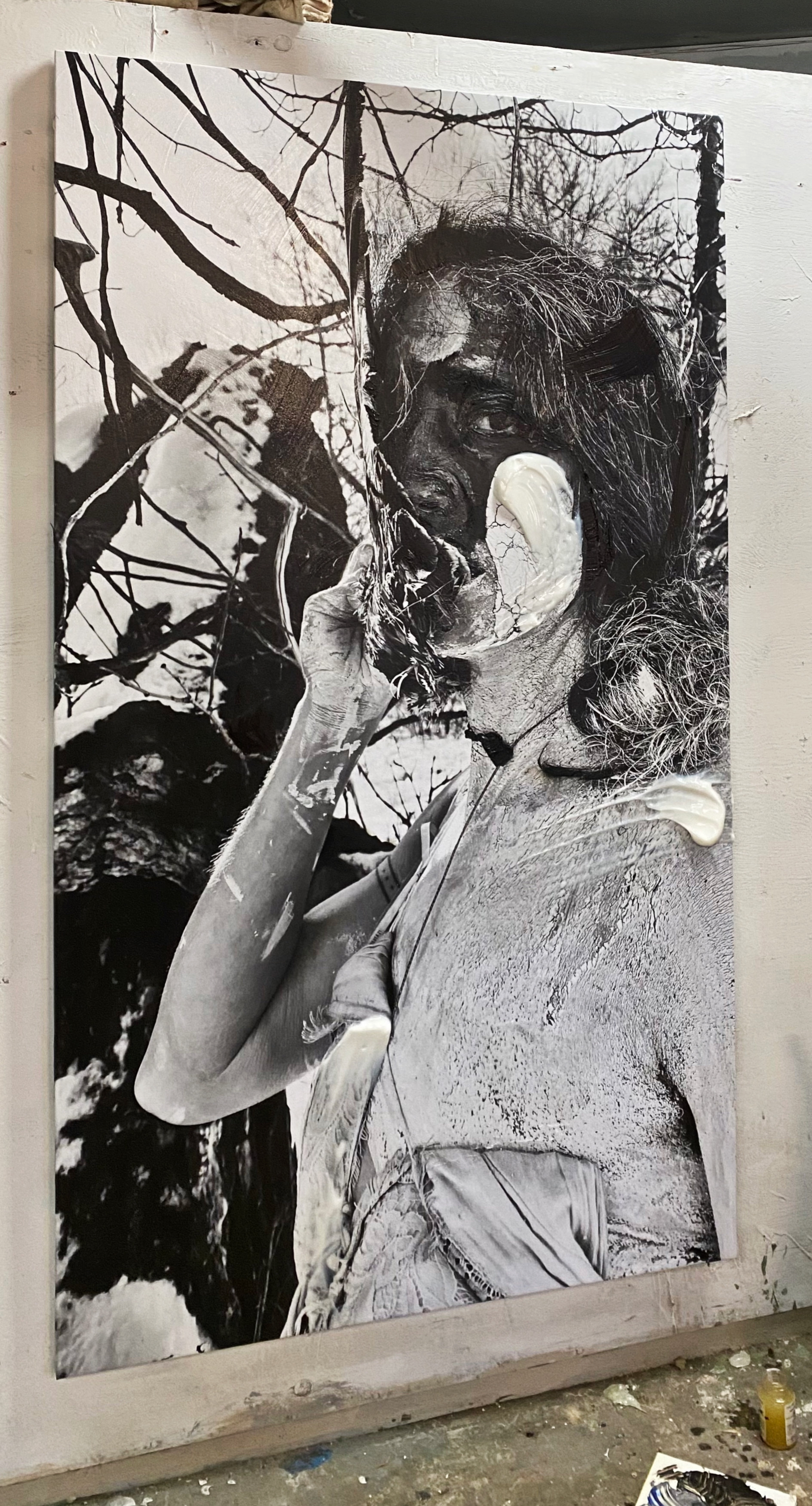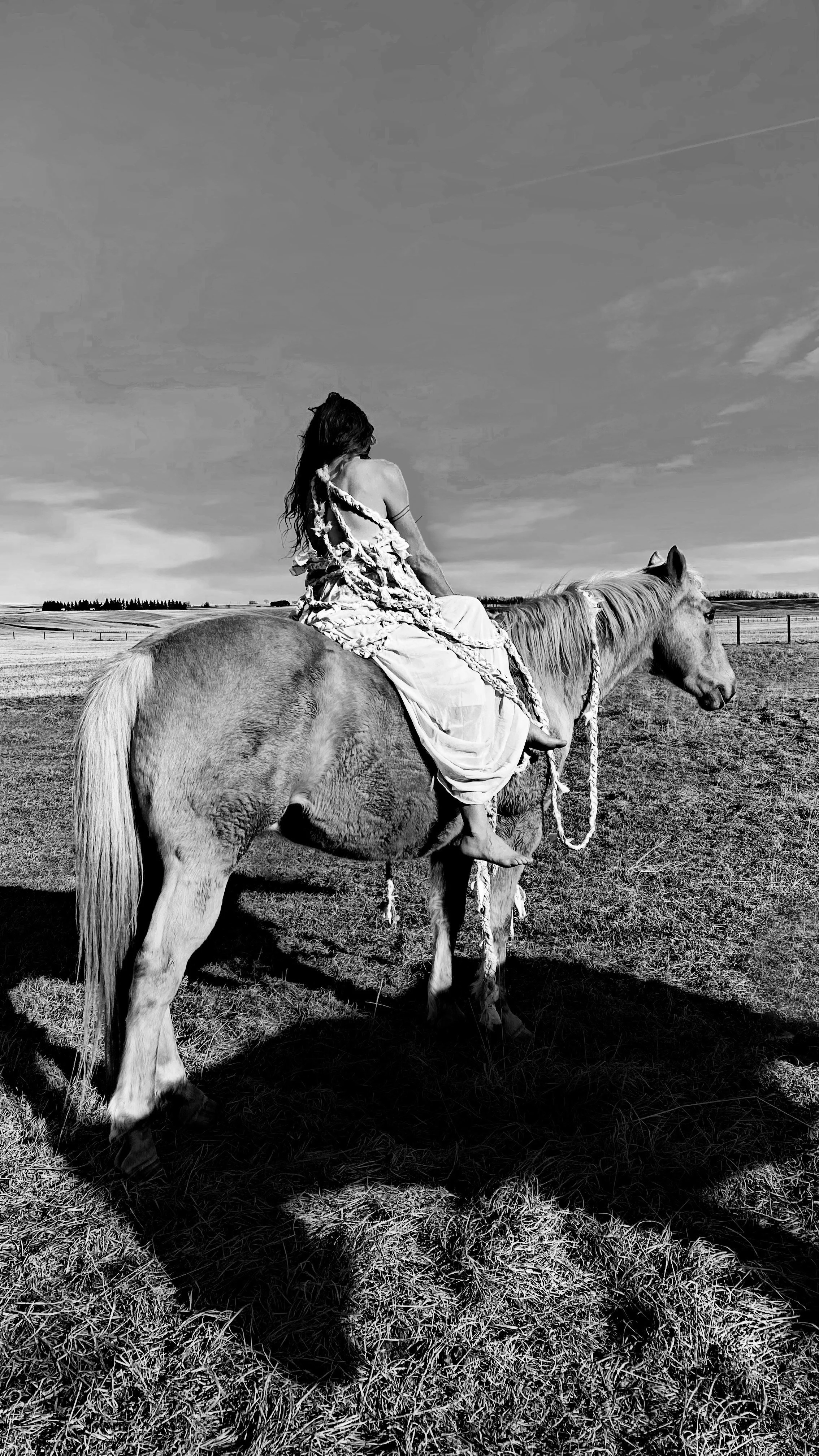 The unforgiving, raw quality of the Alberta landscape appeals to my senses and has truly become the canvas upon which I write. I choose to wield my own body not for display, but rather necessity, as I cannot ask any model to take on the inherent risk or toll on the body that I am willing to go through for a given shot. I have fallen out of a tree when a massive limb cracked, experienced hypothermia, minor shock, abrasions, bruising and my most recent finished work “Shaimaylia,’ featured below involved the use of toxic paint surrounding both my eyes and a found snare around my neck. These choices are intentional. The intent is not to injure or harm, but rather to tell an authentic story by any means necessary.